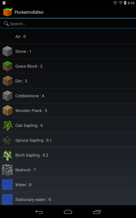 PocketInvEditor adalah editor persediaan untuk Minecraft Pocket Edition. Dengan tool ini, Anda dapat memberikan diri Anda lebih blok dan barang-barang tanpa menulis digit heksadesimal tunggal atau terhubung ke komputer.